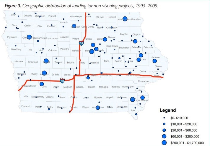 The Community Visioning website also has useful reports under their “Resources” tab that include Evaluation Reports of the program effectiveness and types of projects implemented, Annual Reports on the program, local funding sources, and marketing material that can be used by communities or local organizations for outreach or to promote the program or a particular project initiative. Of particular interest to note is in their report “The Next Step: Making Community Visions a Reality,” they have mapped the number and amount of grants statewide for communities under 10,000 that have participated in the Community Visioning Program (Figure 2) versus those that have not (Figure 3). Those communities that did participate were more successful in receiving grant funding and received greater amounts than the communities that have not participated.